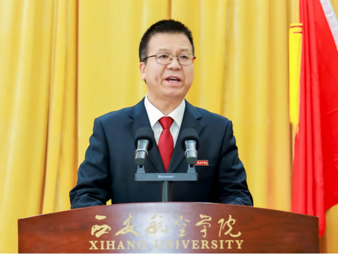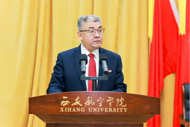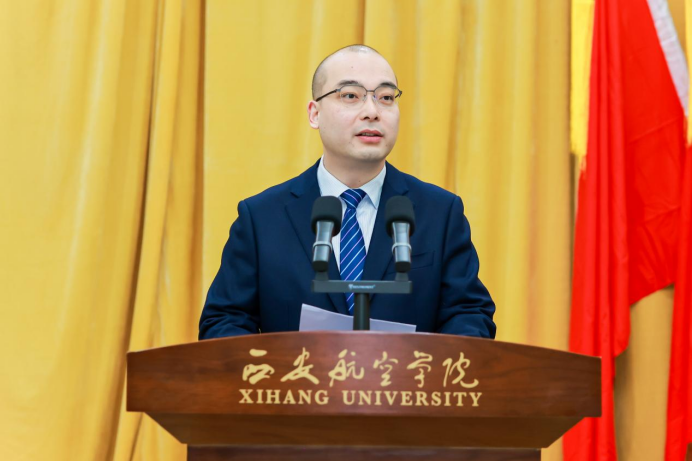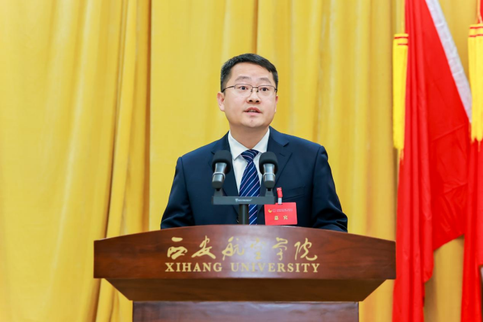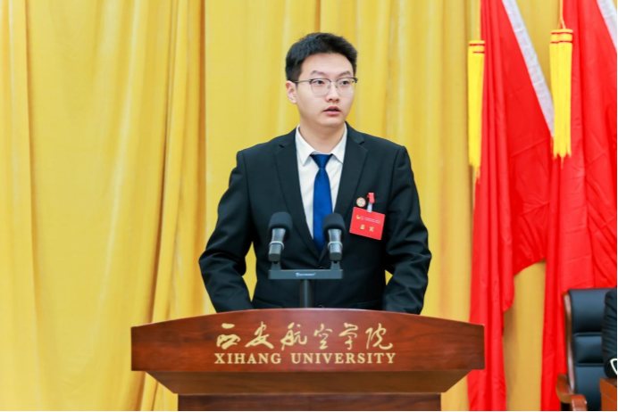 陕西省学生联合会驻会轮值主席张一洋同学代表省学联发言,期待西安航空学院学生会与全省各级学联学生会组织携手共进,团结引领广大同学为谱写陕西高质量发展新篇章,为实现中华民族伟大复兴贡献属于西航学子的青春力量。